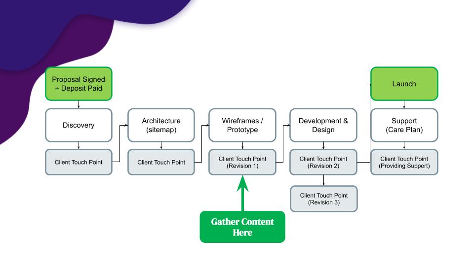 The image above demonstrates what we are trying to say here…The gathering content part of a website project usually happens throughout the entire project (see the red line ? )