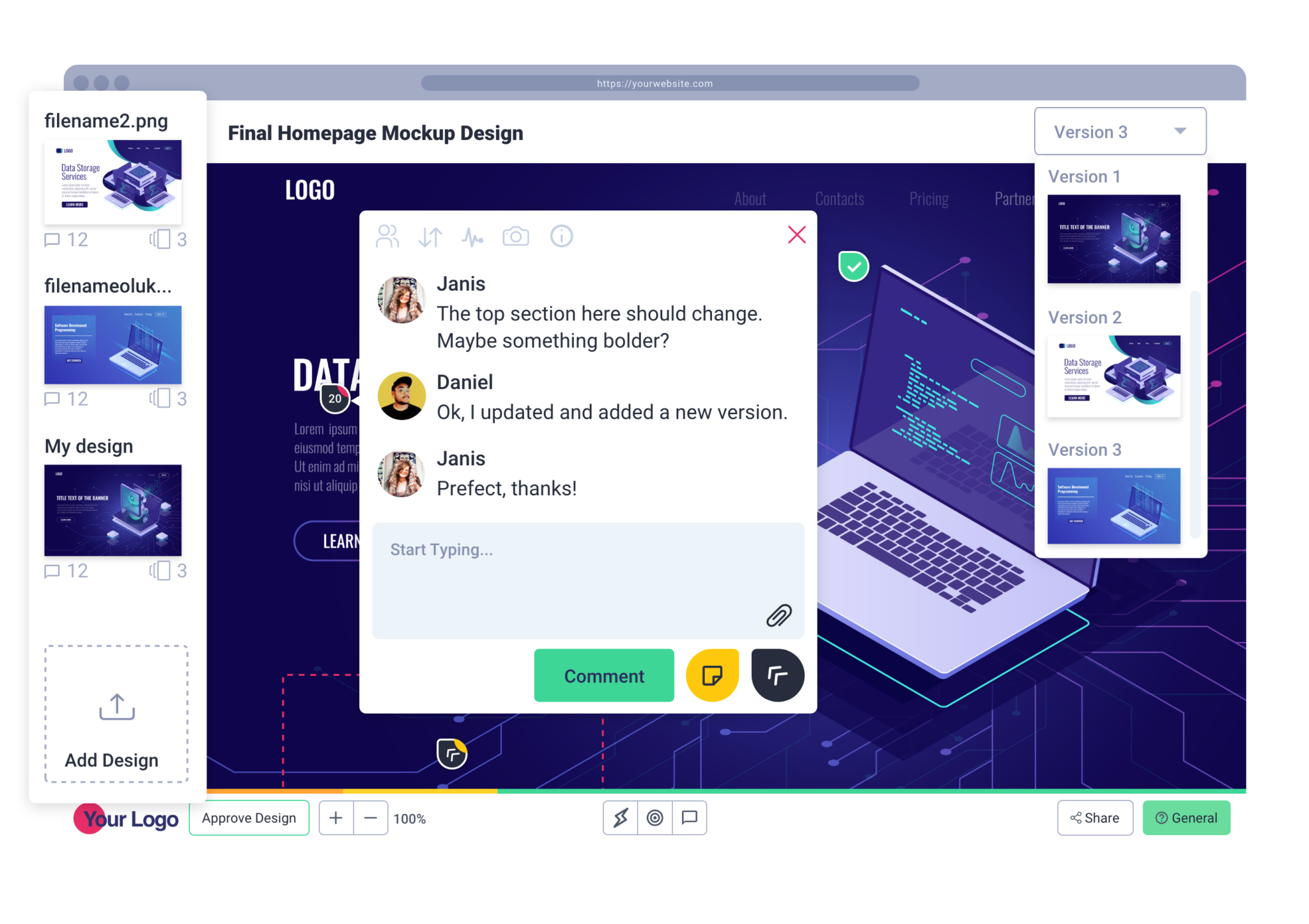 For each design inside an asset, you can upload new versions. This is an amazing way to create an iterative design flow. For example, let’s say you upload a mockup of the homepage for your client, they view it and leave you feedback on what they think you should change…
