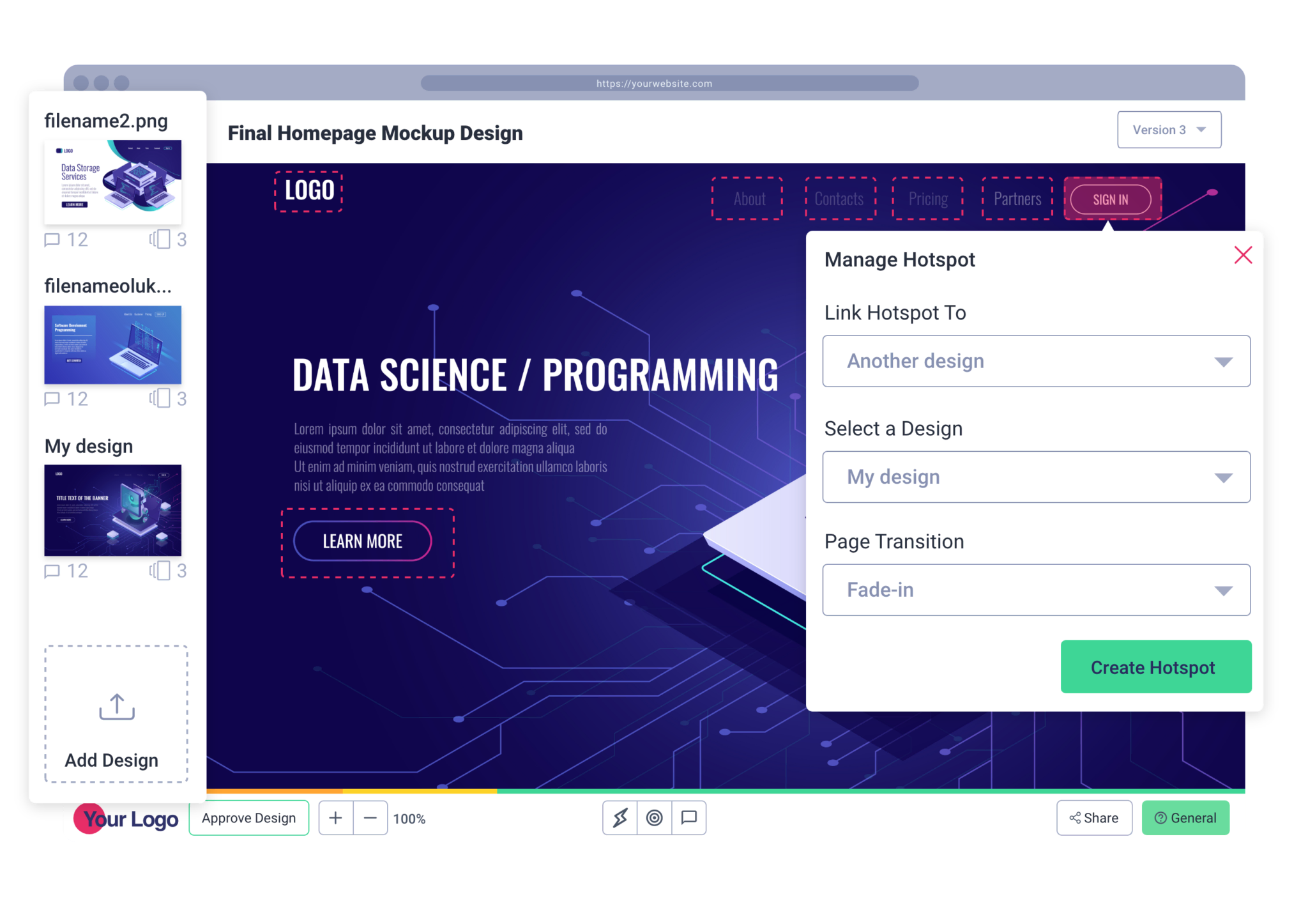 - Hotspots – Create clickable sections on designs to link to other designs, empowering you to create the entire flow of your mockups!