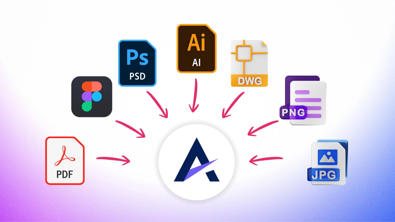 You can upload PDFs, PSDs, AI files, DWG floor plans, PNGs, JPGs, and import Figma frames using the Atarim plugin.
