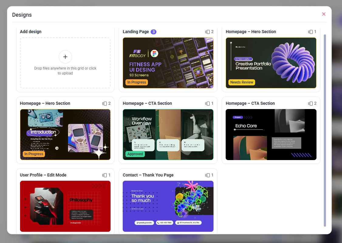 - Maintain Version Control – Upload multiple versions of the same design for easy comparison.