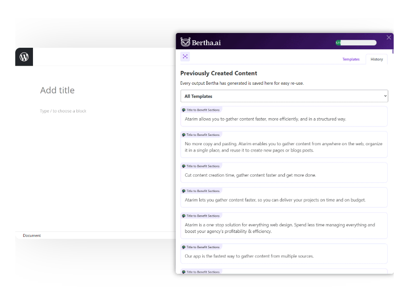 Bertha produces multiple options for you to choose from so that you get ideas, inspiration and full-on text blocks.